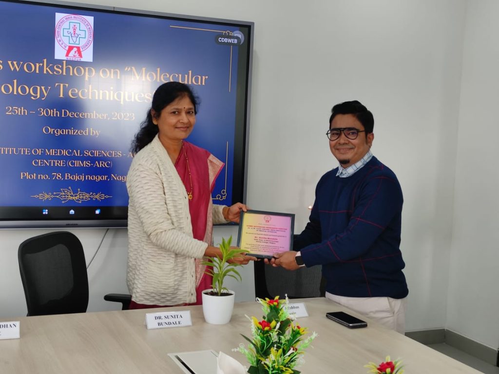 CIIMS-Advanced Research Centre organized a six- days workshop for Post Graduate students of the Department of Microbiology, Government V.Y.T. PG Autonomous College, Durg (CG) 25th -30th December 2023. This workshop aimed to provide knowledge and hands-on experience to the students. We got an amazing response for the workshop as 15 students participated for the workshop. The workshop was inaugurated in the presence of our Chief Guest Dr. Sunita Bundale, Head of the Department, at Hislop College Nagpur. This entire workshop was initiated by renowned scientists Dr. Rajpal Singh Kashyap, Dr. Amit Nayak and Dr. Aliabbas Husain. The technical team for the workshop at CIIMS-ARC, comprised of Ms. Jayshree Shukla, Miss Prachi Gandhi, Ms. Riddhi Thakre, and Ms. Kumari Sneha. The coordinator for conducting this workshop was Ms. Roshni Sharma. It was a successful workshop.